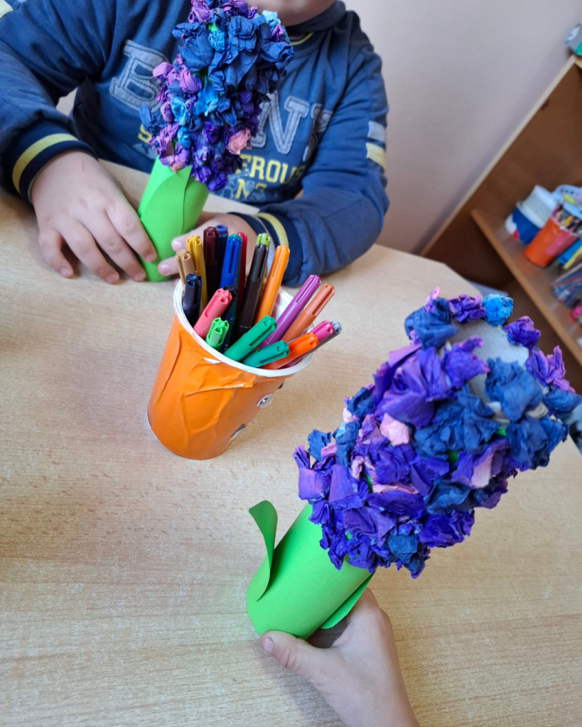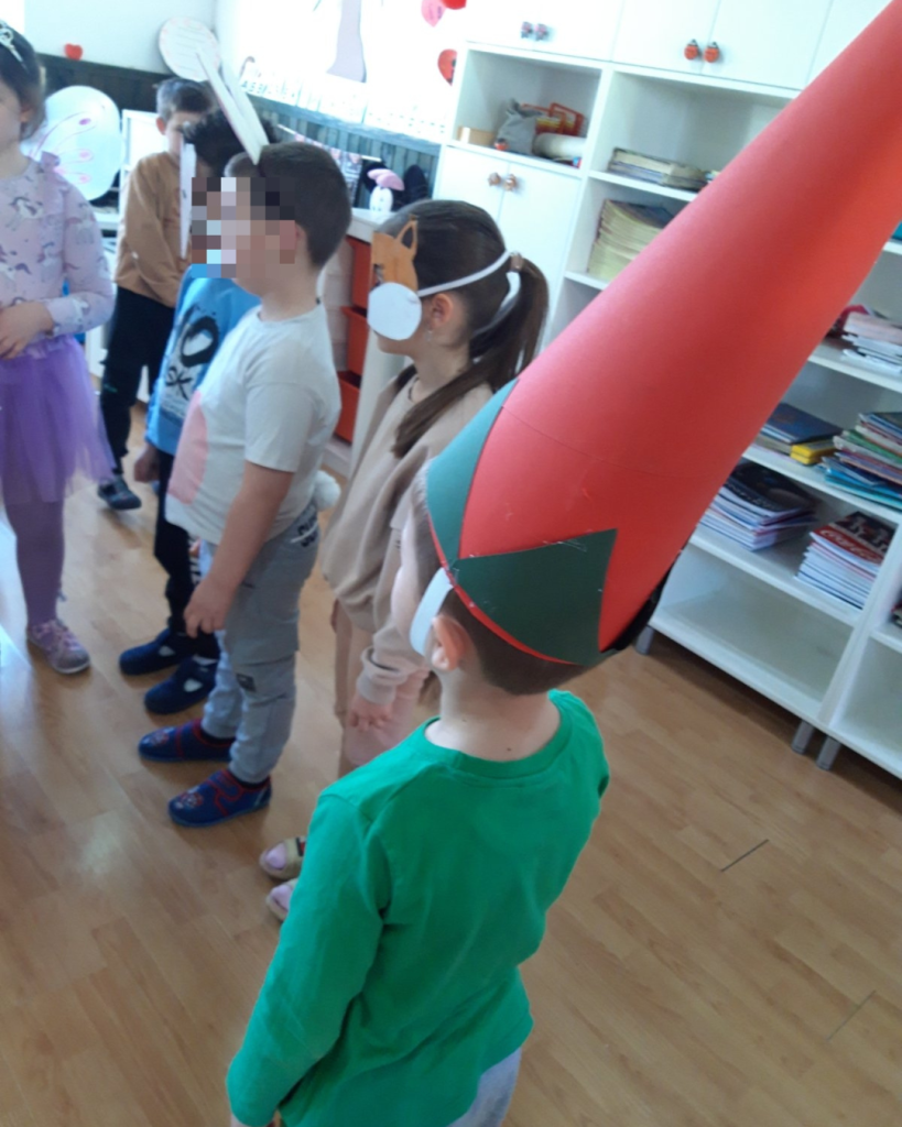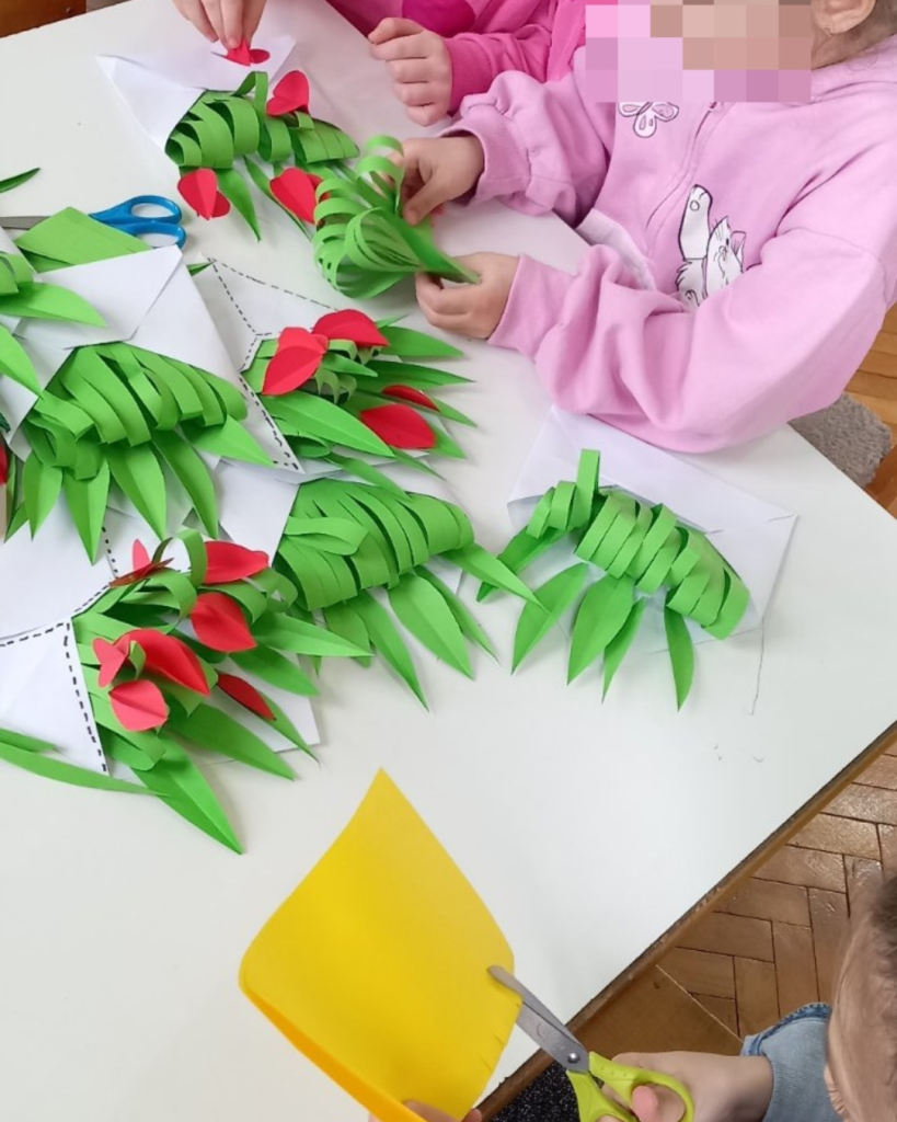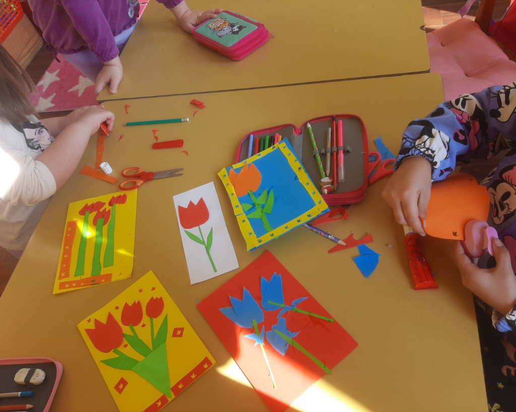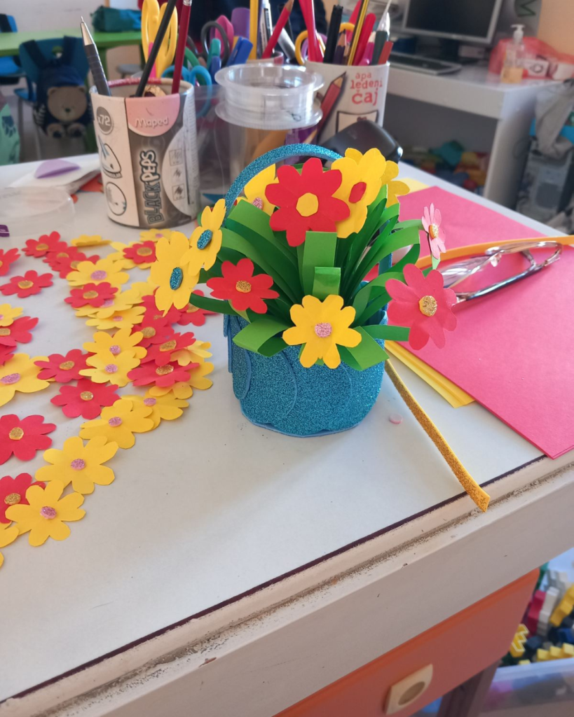 Јаслице су радиле отисак руке у раму. Млађа група је цртала маме и описивали су их. Направили су честитке. Средња група је воденим бојама цртала маме и изложили су радове испред собе. Бојали су семенке па су од њих правили цвеће. Зумбуле су правили од салвета. Старија група је учила песмицу о мами, правили су цвет од хамер папира на штапићи, цртали маме и честитке. Најстарија група је цртала маме темперама, украшавали дрвени цвет на штапићу од сладоле и правили су честитке.
